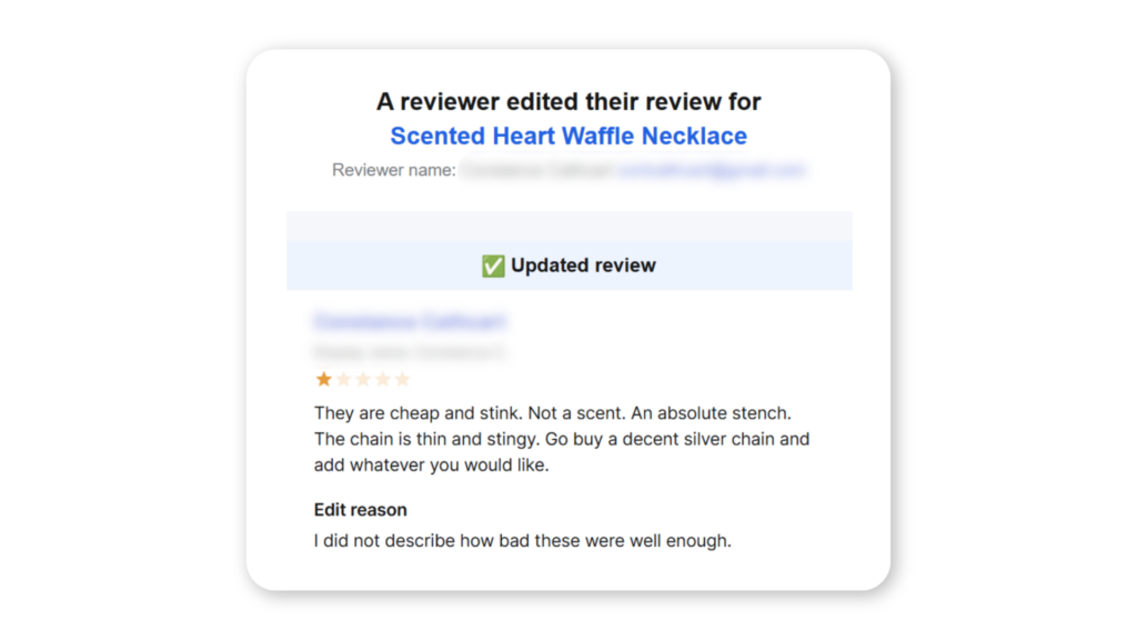 As if that wasn’t bad enough because obviously my products are SO BAD and thousands of previous happy customers are wrong, four minutes later she changed the first review to: