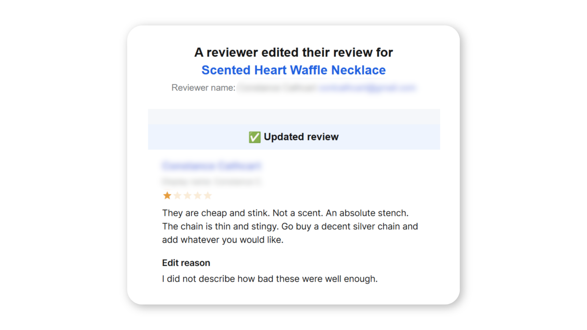 And she had every opportunity to do that but instead, she chose to update her review twice to make it as scathing as possible.