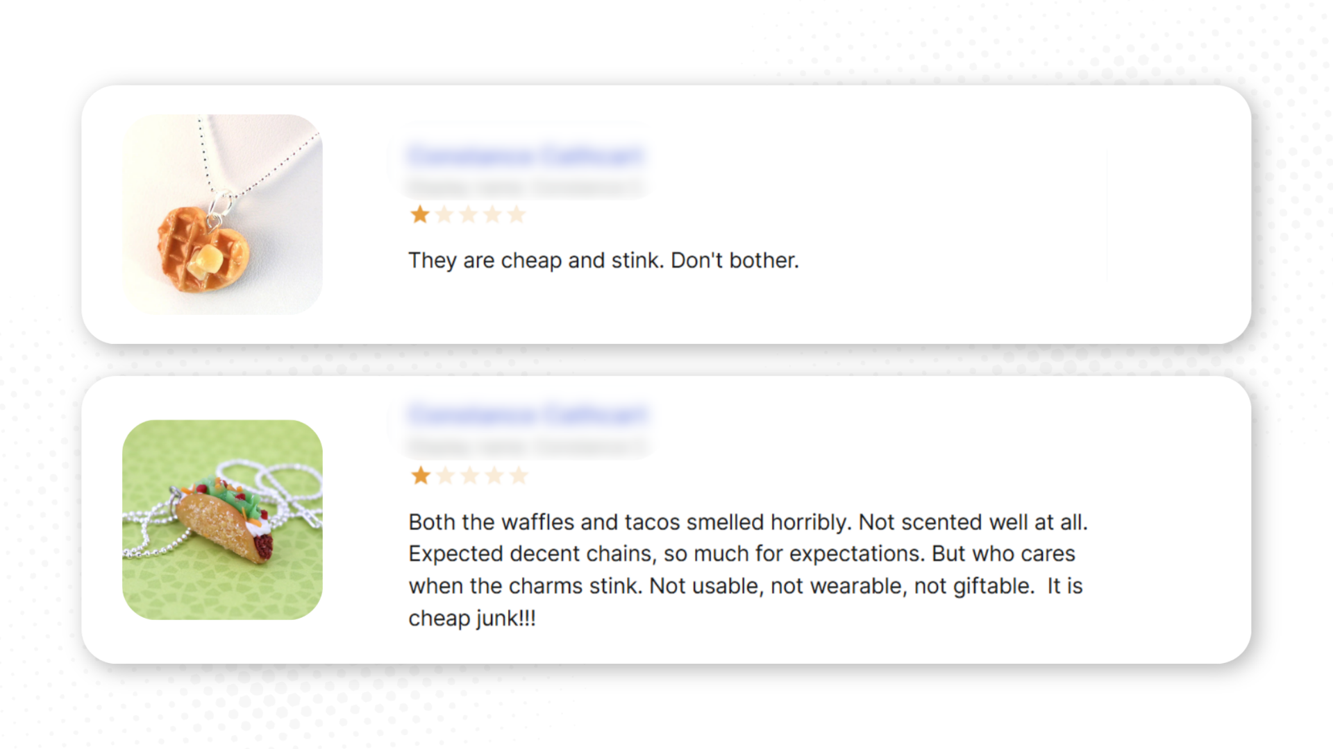 And then she went on to say the waffle and taco charms smelled horrible, the chain was too thin, they were not usable, not wearable, not giftable, and ended it with: “It is cheap junk.”